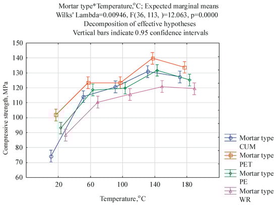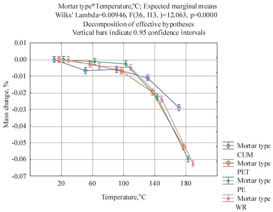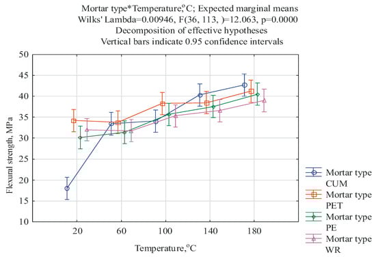 For the results obtained, a multifactorial analysis of variance was performed in relation to the following two factors: (1) the type of mortar and (2) the post-curing temperature. The ANOVA/MANOVA module available in the Statistica 13 program was employed. The first factor occurs at four levels, i.e., CUM, PET, PE, and WR, while the second factor at occurs at five levels, i.e., 20 °C, 60 °C, 100 °C, 140 °C, and 180 °C. The purpose of this analysis was to check whether the type of mortar and post-curing temperature have a statistically significant effect on the mechanical properties and mass change of the mortar samples and whether there is an interaction between these factors. The F-test was applied, with the level of statistical significance of α = 0.05 and a confidence level of 95%. The results of the ANOVA test are given in Table 3. The results of the two-way analysis of variance, given in Table 3, indicate that both the type of mortar and the post-curing temperature significantly differentiate the flexural and compressive strength and the change in mass because the related p-values are lower than α = 0.05. There is also a significant interaction, which means that the effect of a given post-curing temperature depends on the type of mortar. The significance of these interactions is confirmed by the interaction graphs generated in the Statistica 13 program, presented in Figure 2, Figure 3 and Figure 4.