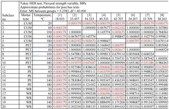Fragment of the Tukey test results sheet obtained for flexural strength (statistically significant differences (p < 0.05) are marked in red).