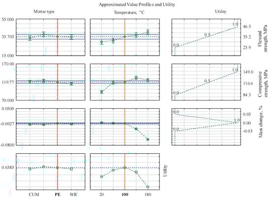 The flexural strength was assigned values from the following range: 23.9 MPa—0 (undesirable), 32.5 MPa—0.5 (intermediate), and 46.5 MPa—1.0 (desirable). Similarly, for the compressive strength, the following range was assigned: 84.2 MPa—0 (undesirable), 116.6 MPa—0.5 (intermediate), and 149 MPa—1.0 (desirable). In turn, the mass change should be small; therefore, the following range was adopted: −0.03%—0 (undesirable), 0%—1 (desirable), and 0.03%—0 (undesirable) (Figure 6).