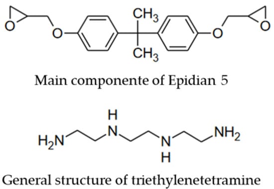 Figure 7 illustrates the structure of the Epidian 5 resin and the triethylenetetramine hardener, which were used in this investigation. As stated by Escola et al. [28], the oxirane rings present in Epidian 5 resin act as sites for crosslinking reactions. Consequently, in an FTIR spectrum, this functional group (800–1000 cm−1) is no longer present when interacting with multifunctional amine-type hardeners, such as triethylenetetramine, and hydroxyl functional groups (3300–3700 cm−1) are generated [28,29]. Moreover, the application of temperature during the curing process influences the hardening rate. The presence of residual absorption bands in the region of approximately 920 cm−1 has been observed in samples cured at low temperatures [30].