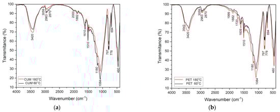 FTIR spectra of (a) CUM samples and (b) PET samples.