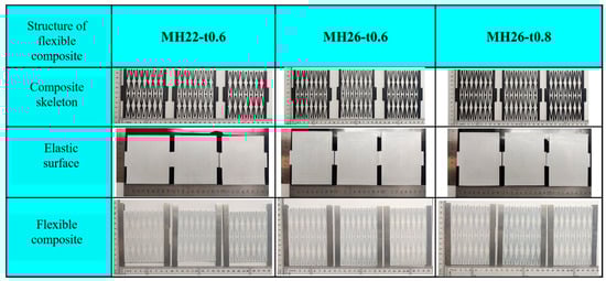 The three zero Poisson ratio flexible composites are named MH22-t0.6, MH26-t0.6, and MH26-t0.8, respectively, with suffixes representing the test methods, such as “-T” representing the in-plane tensile test and “-CT” representing the in-plane cyclic loading test.
