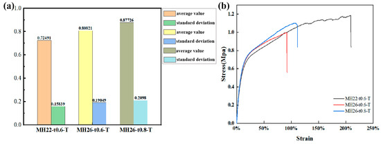 (a) Mean–standard deviation graph. (b) In-plane tensile test curve of flexible composite with zero Poisson ratio.