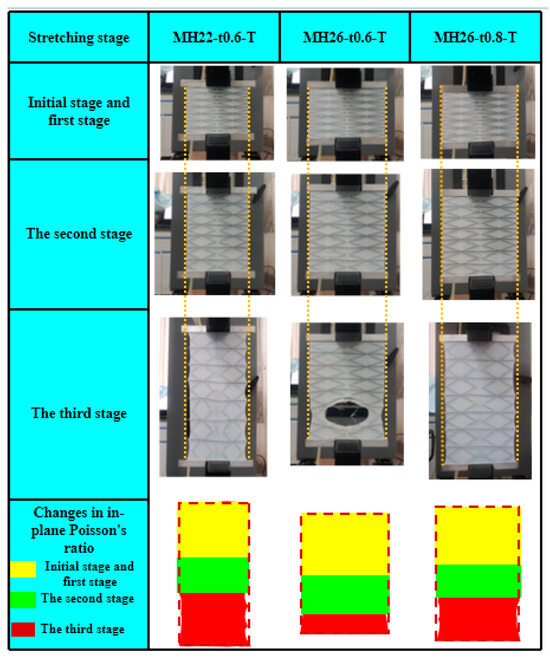 Figure 6 shows the mechanical curves resulting from the in-plane tensile tests conducted on three types of flexible composite materials featuring a zero Poisson ratio. The mechanical responses of all these flexible composite materials exhibit consistent pattern and can be roughly divided into three stages: (1) Initial stage and elastic deformation stage: The elastic deformation strain exhibited by the flexible composite materials is minimal, exemplified by the in-plane elastic strain of 1.52% ± 0.12% observed in the MH22-t0.6-T test. During this stage, the slope of the curve is constant, signifying that the stress increases linearly with the increase in strain. It should be noted that the initial portions of the zero Poisson ratio flexible composites nearly coincide, as the in-plane stiffness of the elastic surface is much higher than that of the honeycomb reinforcement, which primarily governs the in-plane mechanical properties of the flexible composites. (2) Plastic deformation stage: In this stage, the slope of the curve ceases to be constant and gradually decreases, resulting in a nonlinear relationship between stress and strain. Although the composite skeleton has a high in-plane elastic strain, the increase in toughness during this period is mainly caused by the plastic changes generated by the highly elastic polyurethane material. (3) Progressive damage stage: For the sample of flexible composite material MH22-t0.6-T, the damage process is quite long and tortuous until the damage and failure finally occur, while for the sample of flexible composite material MH26-t0.6-T and MH26-t0.8-T, the damage and failure stages are relatively brief.