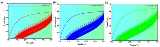 The mechanical curves of the flexible composite materials with zero Poisson ratio obtained in the cyclic load test are shown in Figure 8. Due to the hysteresis effect, the loading and unloading curves of the mechanical curves do not match, forming a hysteresis loop. This is due to the polymer chain segment of the TPU material which has a relative movement, and the internal friction resistance makes the chain segment movement lag during the loading process. As can be seen from the figure, the hysteresis area obtained by the first loading is the largest, and the energy during the subsequent loading decreases significantly. Furthermore, during the loading process, the unloading curve gradually shifts to the right, with the hysteresis loop area decreasing steadily.