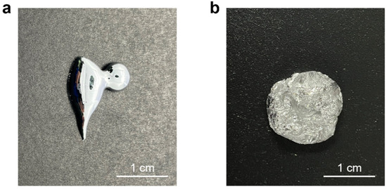 The incorporation of WO3 significantly altered the physical state of the Bi-In-Sn alloy. Figure 3 shows this transformation by comparing the pure Bi-In-Sn alloy (Figure 3a) with the Bi-In-Sn/WO3 composite (Figure 3b). The pure Bi-In-Sn alloy showed high fluidity, posing potential leakage challenges in practical applications. However, the incorporation of WO3 altered the physical state of the alloy, transforming it from a liquid to a more putty-like, semi-solid form. The change significantly reduced the risk of leakage, enhancing the composite’s suitability for use as an effective thermal interface material.