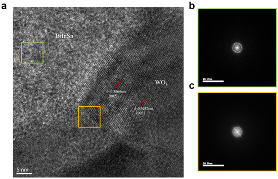 Further evidence for the formation of the interface was obtained through high-resolution transmission electron microscopy (HRTEM) and a selected area electron diffraction (SAED) analysis. Figure 7a presents the HRTEM image of the Bi-In-Sn/WO3 interface, clearly illustrating the distinct boundary between the two phases. Figure 7b,c show the SAED patterns corresponding to the Bi-In-Sn region and the transition interface, respectively. The diffraction pattern at the interface revealed a combination of crystalline order and partial distortion, likely arising from the incorporation of Bi-In-Sn atoms into the WO3 lattice.