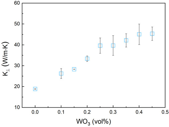 Figure 8 shows the variation in thermal conductivity with the WO3 mass fraction. An increase in WO3 content led to a remarkable enhancement in thermal conductivity, likely due to the formation of continuous heat conduction pathways within the matrix. The enhancement can be attributed to the high intrinsic thermal conductivity of WO3, which enables more efficient heat transfer within the material. At higher WO3 concentrations, the material may approach a percolation threshold where interconnected WO3 networks are formed, which further enhances the heat transfer efficiency. Therefore, the integration of WO3 particles significantly enhanced the heat dissipation capability of the composite, positioning it as an optimal choice for applications that require effective thermal management. When the WO3 content exceeds 0.5 vol%, the composite shifts into a discontinuous, powder-like state [24], which complicates accurate thermal conductivity measurements and limits its effectiveness as a phase change thermal interface material.