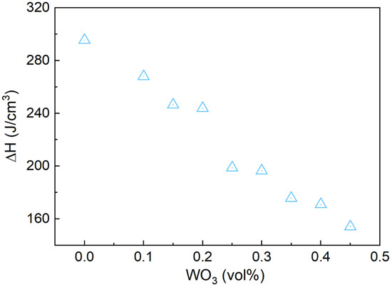 Volumetric latent heat of Bi-In-Sn/WO3 composite as function of WO3 mass fraction.