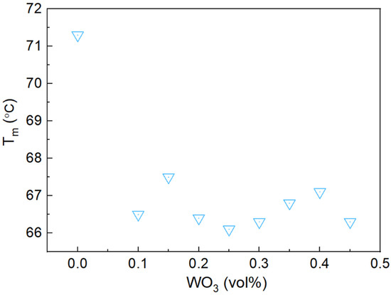 Figure 11 shows the variation in the phase transition temperature (Tm) of the Bi-In-Sn/WO3 composite relative to WO3 content. As illustrated, the phase transition temperature slightly decreases as WO3 content increases, especially once WO3 concentration exceeds 0.1 vol%. This reduction is likely due to the dilution effect of WO3—a non-phase change material—within the Bi-In-Sn matrix. The presence of WO3 disrupts the alloy’s uniform structure, lowering the overall phase transition temperature. Despite this decrease, the composite maintains a phase transition temperature suitable for effective thermal management applications. At higher WO3 concentrations, the transition temperature stabilizes, indicating that further increases in WO3 content have a minimal impact on the composite’s phase change properties.