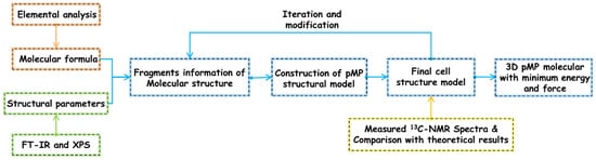 The formulation of pMP molecular models adhered to the following fundamental principles (as illustrated in Figure 1): initially, the pertinent structural parameters, such as the details about elemental composition, proportions, and functional group information, were garnered from experimental characterizations; thereafter, based on these revelations, the molecular framework was constructed utilizing Materials Studio (MS 6.0) software, with optimization procedures executed to achieve energy and force minimization; finally, NMR measurements were employed to elucidate the average carbon skeletal structure, thereby substantiating the rationality of the fabricated pMP molecular models. According to the molecule fragments identified in Figure 2, Figure 3 and Figure 4, the molecular model with its three-dimensional periodic structure of corresponding pMP macromolecular system was constructed with the Amorphous Cell module in MS. This module employed a Monte Carlo approach to assembling molecules within a cell, while ensuring a realistic distribution of torsion angles in accordance with any given force field, thereby minimizing atomistic interactions. Moreover, the initial density of the molecular models was set at 0.5 g/cm3 to preclude the superposition of an aromatic ring structure during the model construction. The COMPASS force field and constant-pressure, constant-temperature (NPT with a certain number of particles (N), pressure (P), and temperature (T)) ensemble in the Forcite module were utilized to perform the dynamic simulations under high-pressure conditions (300 K, 100 Mpa) to rationalize the system equilibrium, followed by an annealing procedure utilizing the canonical ensemble (NVT with a certain number of particles (N), volume (V), and temperature (T)) to conduct structural energy optimization. The Berendsen approach was employed in both the NPT and NVT ensembles to control the temperature/pressure parameters, with the damping coefficient and time step configured at 0.1 ps and 1 fs, respectively.
