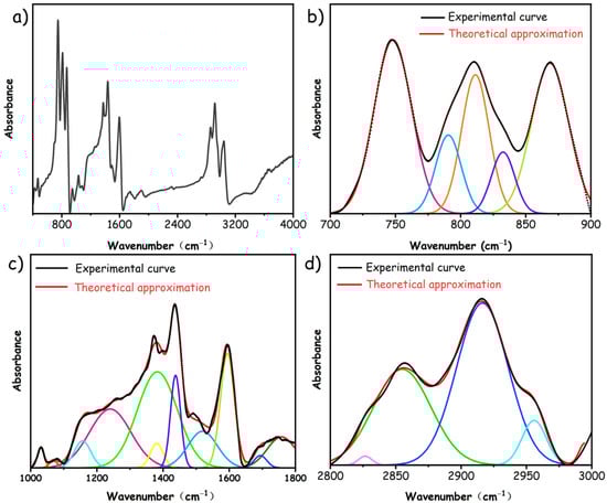 (a) FTIR spectra, Curve-resolution into different components, including (b) aromatic structure, (c) characteristic functional groups, and (d) aliphatic functional groups.