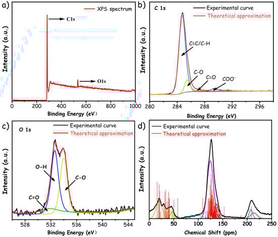 In addition, XPS measurements have also been utilized to unveil the elemental composition and their corresponding percentage within pMP molecules, similar to the procedures conducted with other carbonaceous precursors [35,36,37]. Figure 3a–c depicts the XPS spectra and their correlative curve-resolution into different components. According to the results presented in Figure 3b and Table 3, it suggests that the molecular architecture of pMP is mainly composed of aromatic rings, as indicated by the notably higher proportion of C=C bonds (82.58%), which is consistent with the findings of FTIR spectroscopy. Otherwise, the diverse forms of oxygen species have been investigated, where phenolic hydroxyl is speculated to be the preferential functional group, supported by the calculated proportions of O–H (49.88%) and C–O (38.31%) depicted in Figure 3c and Table 3.