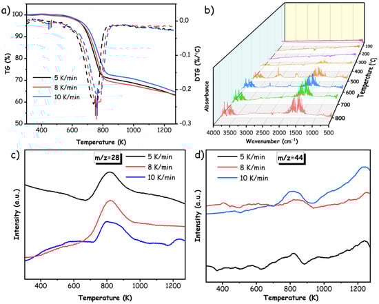 The TG-FTIR instrument (Bruker TGA-IR/NEZTSCH STA 449 F5, Bielerica, MA, USA) was deployed for continuous monitoring of the relative mass variation and the specific composition of gaseous products. Throughout the experimental procedure, precise temperature control was upheld for both the inlet and outlet pipelines, as well as the gas reservoir, steadfastly maintained at 473 K. Additionally, argon (Ar) served as the protective atmosphere with a volumetric flow rate of 50 mL/min. The pyrolysis temperature underwent incremental escalation from ambient temperature to 1273 K, orchestrated at controlled heating rates of 5 K/min, 8 K/min, and 10 K/min. Otherwise, meticulous calculation of the derivative thermogravimetric (DTG) curve was executed to pinpoint the temperature corresponding to the maximum rate of pyrolysis reaction.