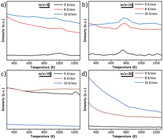 In addition, the experimental in situ TG-MS technique was utilized to explore and identify the light gaseous products generated during the pyrolysis behavior of pMP. As depicted in Figure 5c,d and Figure 6, the characteristic signal corresponding to H2 (m/z = 2), CH4 (m/z = 16), H2O (m/z = 18), C2H4 (m/z = 28), C2H6 (m/z = 30), and CO2 (m/z = 44) were discovered as the gaseous product in pyrolysis proceedings. It is noteworthy that the potential presence of CO (m/z = 28) as a product was ruled out due to the absence of discernible characteristic peaks in TG-FTIR analysis (as illustrated in Figure 5b). Further experimental measurements were conducted with varying heating rates (5 K/min, 8 K/min, and 10 K/min) to thoroughly examine the influence of heating rates on the pyrolysis behavior of pMP. According to the findings, it indicated that variations in heating rates had minimal effect on the thermodynamic aspects (e.g., decomposition temperature) governing pyrolysis behavior, as substantiated by the uniformity of characteristic peaks observed in the resultant gaseous products. For example, the emergence of C2H4 species remained consistent at approximately 793 K across different heating-rate regimes. However, the heating rate determined the kinetic progression of gaseous products, thereby affecting their yield, as demonstrated in Figure 5c,d and Figure 6. Generally, there was an inverse relationship between the yields of C2H4/H2O and the rate of temperature increase, with a higher rate leading to decreased output. In contrast, other gaseous products (such as CH4) exhibited a positive correlation. This is likely attributed to the rapid heating rate impeding the subsequent molecular condensation of alkanes and re-reduction reactions of CO2 accompanying hydrogenation, resulting in limitations that reduced the production of C2H4 and H2O, while preserving the originally consumed gaseous species.