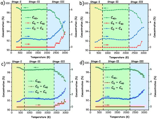 Although the aforementioned experimental measurements provided subjective insights into the pyrolysis behavior of pMP, the complexities of pyrolysis mechanisms, particularly the temperature-dependent atomic-scale structural alterations, remain a puzzle for scientists. To address this situation, we delved into theoretical ReaxFF MD simulations to enhance the understanding of overall product distribution on a nanoseconds scale. Figure 7 depicts the profiles of weight loss and major pyrolyzates with temperatures derived from ReaxFF MD simulation within the range of 300–3000 K at various heating rates of 10 K/ps, 20 K/ps, 30 K/ps, and 40 K/ps (denoted as pMP-10 K/ps, pMP-20 K/ps, pMP-30 K/ps, and pMP-40 K/ps). Taking pyrolysis behavior with a heating rate of 10 K/ps as an example, three representative stages were empirically delineated, wherein the amounts of C40+ fragments that were deemed as original samples at the initial decomposition stage I gradually decreased with increasing temperatures in the range of 300–550 K, concomitantly revealing the presence of light gaseous species (C0~C4). It was indeed consistent with the findings obtained from TG experiments in Figure 5a and demonstrated that ReaxFF MD simulation could reproduce pyrolysis processes of pMP to some extent, although the temperature range and quantitative values for weight loss were different between simulations and experiments. Upon further elevation of the simulated temperature, the proportion of the C40+ fragment exhibited nominal alteration during stage II (550–2000 K), subsequently plummeting sharply to yield low molecular tar (C5~C40) and gaseous products within the high-temperature ranges of stage III (2000–3000 K). This tendency in pyrolysis behavior was similarly observed in other cases, albeit causing an extension of the temperature range for each stage as the heating rate increased. For instance, at a heating rate of 40 K/ps, the initial decomposition reactions (stage I) occurred within the range of 300–800 K, surpassing the temperatures manifested at 10 K/ps. This phenomenon could potentially be ascribed to the accelerated reaction rates, leading to incomplete thermal decomposition processes that necessitate a prolonged reaction duration for completion. Moreover, the C40+ fragment at elevated temperatures was regarded as residual products, in which their concentration following the acceleration of the heating rate (93.4% in pMP-10 K/ps vs. 96.9% in pMP-40 K/ps) aligned with the experimental trends and verifies the rationality of the ReaxFF MD approach. Importantly, the increasing trends of large fragments at high temperatures were also detected from ReaxFF MD simulation to suggest the recombination reactions taking place frequently, which was not accessible by TG experiments. Overall, elevations in the heating rate may result in decreases in gas and tar production while simultaneously enhancing char output, which is most likely caused by an inadequate reaction within a short time period [47].
