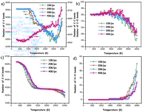 Evolutionary behaviors of associated chemical bonds during the simulated pyrolysis procedures at various heating-rate, involving (a) C–C bonds; (b) C–O bonds; (c) C–H bonds; and (d) H–H bonds.
