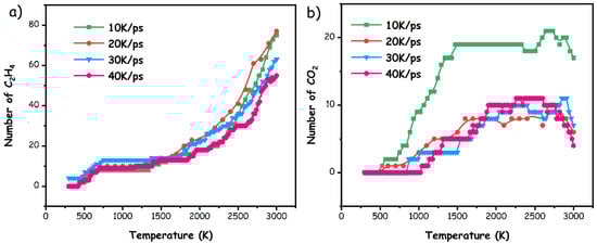 As the principal volatile compounds produced during the pyrolysis of pMP, the alkene (predominantly C2H4) played a crucial role in determining the pyrolysis mechanisms. As depicted in Figure 9, the variations of C2H4 and CO2 species with the temperature were calculated by integrating the theoretical count of molecules in ReaxFF MD to validate the accuracy of the simulation. Accordingly, a mere trace of C2H4 and CO2 products were identified, aligning with the experimental observations originating from the initial decomposition of bridge bonds and aliphatic hydrocarbons in pMP. As the temperature increased, the number of both substances remained constant, which could be explained by the predominant cleavage of C–H bonds in this temperature region (as illustrated in Figure 8c), promoting the formation of C–O or unsaturated C–C bonds. At relatively higher temperatures, the production of C2H4 dramatically increased, while the concentration of CO2 decreased, in accordance with the experimental TG-FTIR outcomes. Meaningfully, the evolution trends based on the TG-FTIR/MS experiments and ReaxFF MD simulations were comparable with each other, in which the productivity of C2H4 species decreased with heightened heating rates, while the CO2 exhibited the opposite response.