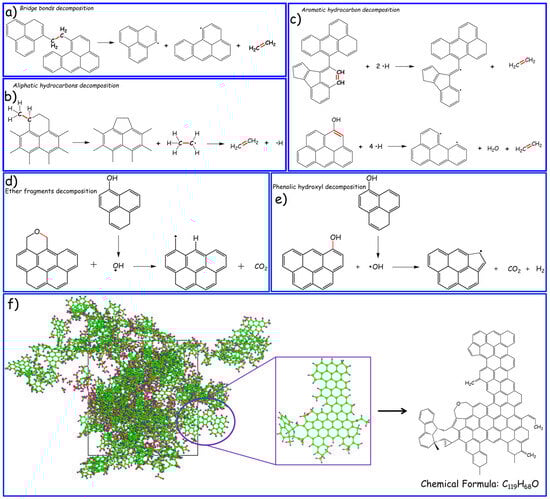 In order to unveil the evolutionary behaviors of microstructure configurations at varied temperatures at an atomic level, the VARxMD software visualization tool (V2.0 version) was utilized to analyze the simulation trajectories to obtain major product distribution and the involved reactions [48]. The representative reaction pathways observed through VARxMD, as depicted in Figure 10, have been enumerated here for the purpose of discussing the pyrolysis mechanism of pMP. Taking the C2H4 species as an example, the bridge bonds and aliphatic hydrocarbons favored to be cleaved to yield C2H4 gases at relatively low temperatures, while the decomposition of aromatic hydrocarbon decomposition and ring-opening processes preferred to be implemented as the temperature further increased, as depicted in Figure 10a–c. Furthermore, new covalent bonds, including carbon–carbon and carbon–heterogeneous bonds, have been documented, leading to the extension of a molecular skeleton of organic compounds and alterations in the chemical composition of alkylated compounds. Moreover, the oxygen-containing gaseous products, including CO2 and H2O, were also investigated to elucidate the intricate pyrolysis mechanisms of pMP, as illustrated in Figure 10d,e. According to the simulated findings, the oxygenated fragments derived from ether and phenolic hydroxyl groups preferentially decomposed to generate CO2 gas molecules during the pyrolysis process. At higher temperatures, the resultant CO2 and oxygen-containing functional groups readily interacted with hydrogen radicals to yield H2O species. This phenomenon is consistent with the evolutionary behavior of relevant chemical bonds, wherein the generation of CO2 during the pyrolysis process induces an increase in the number of C–O bonds, which are subsequently consumed as the temperature rises to produce H2O. It is noteworthy that the observed graphitization phenomenon within the ReaxFF MD simulation, wherein localized aromatic hydrocarbons exhibited a propensity to polymerize at high temperatures, gave rise to a microscale morphology resembling graphite layers with sustained skeletal alignment, as visualized in Figure 10f. This discovery, uncommon in other carbonaceous precursors such as coal, underscores a remarkable degree of structural organization in pMP. These revelations hold promise in addressing the present lack in understanding of pyrolysis mechanisms among diverse carbonaceous precursors at a molecular level, with particular relevance to pMP.