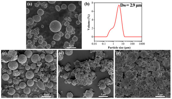 Based on previous research [14], FA particles were pretreated with different concentrations of the NaOH solution, and the morphologies of untreated FA and alkali-activated FA particles are shown in Figure 1. From Figure 1a, we can observe that the graded FA particles are mainly spherical with only a few irregular shapes, and the particle size distribution of FA was measured to be D50 = 2.9 μm, as shown in Figure 1b. It can be clearly seen that the particle size distribution of SH012F is narrow. Smaller particles stick together, attributed to its high surface activity, as shown in Figure 1a. The morphologies of alkali-activated FA particles with concentrations of 0.3, 0.6, and 1.2 mol/L of the NaOH solution are shown in Figure 1c–e, respectively. From Figure 1c, we can observe that there is no significant change in the FA surface after alkali activation with the 0.3 mol/L NaOH solution. However, the polymer reaction occurs on the FA surface after alkali activation in the 0.6 mol/L NaOH solution, resulting in the adhesion of FA particles, especially for small particles. The larger particles showed slight surface polymerization but did not result in cross-linking, which indicates that the smaller the particle size of FA, the higher the surface activity and the stronger the geopolymer reaction. It can be clearly seen that all FA particles react and crosslink together with an increase in the NaOH concentration, as shown in Figure 1e. In conclusion, the concentration of NaOH varies with the different particle sizes of FA. This is significant in the selection of a suitable concentration for alkali activation.