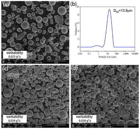 For large particle sizes of FA (SH090), the morphologies and particle sizes of FA and A-FA particles are shown in Figure 2. Compared with SH012F, untreated-FA (SH090) has a smooth surface and good sphericity, and its average particle size is 13.8 μm, as shown in Figure 2a,b. After classification, the particle size distribution of SH090 became narrow, which indicates that the particle size of graded FA is even. Also, fly ash particles are good for silane modification because of their larger size and better dispersion. Figure 2c shows the morphologies of alkali-activated FA with a concentration of 0.6 mol/L of NaOH. It can be clearly seen that there is no significant change in the surface of FA after alkali activation, with good dispersion and no cross-linking, which indicates that there is no geopolymer reaction occurring or the geopolymer reaction is not strong. In comparison with Figure 1e, it can be clearly observed that the surface of FA (SH090) treated with 1.2 mol/L NaOH showed a slight polymer reaction and a roughened surface without cross-linking, as shown in Figure 2d. This further indicated that it is not easy to cross-link NaOH with a large particle size of FA because of its low activity. Fly ash particles have good hydrophilicity because of the hydroxyl on their surfaces, so it is difficult to evaluate the surface wettability with the contact angle. A surface tension meter was used to evaluate the surface wettability of FA before and after alkali activation. The surface wettability of untreated FA was 0.025 g2/s. After alkali activation, the surface wettability of 0.6-A-090FA and 1.2-A-090FA was 0.034 g2/s and 0.030 g2/s, respectively. Compared with 0.6-A-090FA, the surface wettability of 1.2-A-090FA decreased, which was attributed to the corroding of the active substance on the FA surface by 1.2 mol/L NaOH. 0.6-A-090FA will be used for silane modification because of its high surface wettability as this high wettability is beneficial to silane modification.