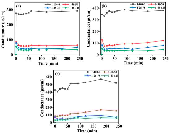 The variation in the conductivity of silane solutions: (a) 20 °C, (b) 40 °C, and (c) 60 °C.