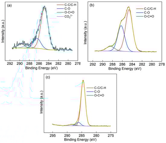 Similarly, XPS analysis was carried out for A-FA before and after modification by KH560 and the C1s spectra were fitted, as shown in Figure 4. There are four clearly defined contributions in the C 1s spectra assigned; in the order of increasing binding energy (BE), they are C-C/C-H, C-O, O-C=O, and C bonded to three O atoms [24,25]. The shifts relative to the hydrocarbon peak are 1.51, 3.83, and 4.85 eV for the C-O, O-C=O, and CO32− components, respectively [26], which are present on all surfaces exposed to the air and carbonate of FA, as shown in Figure 4a.