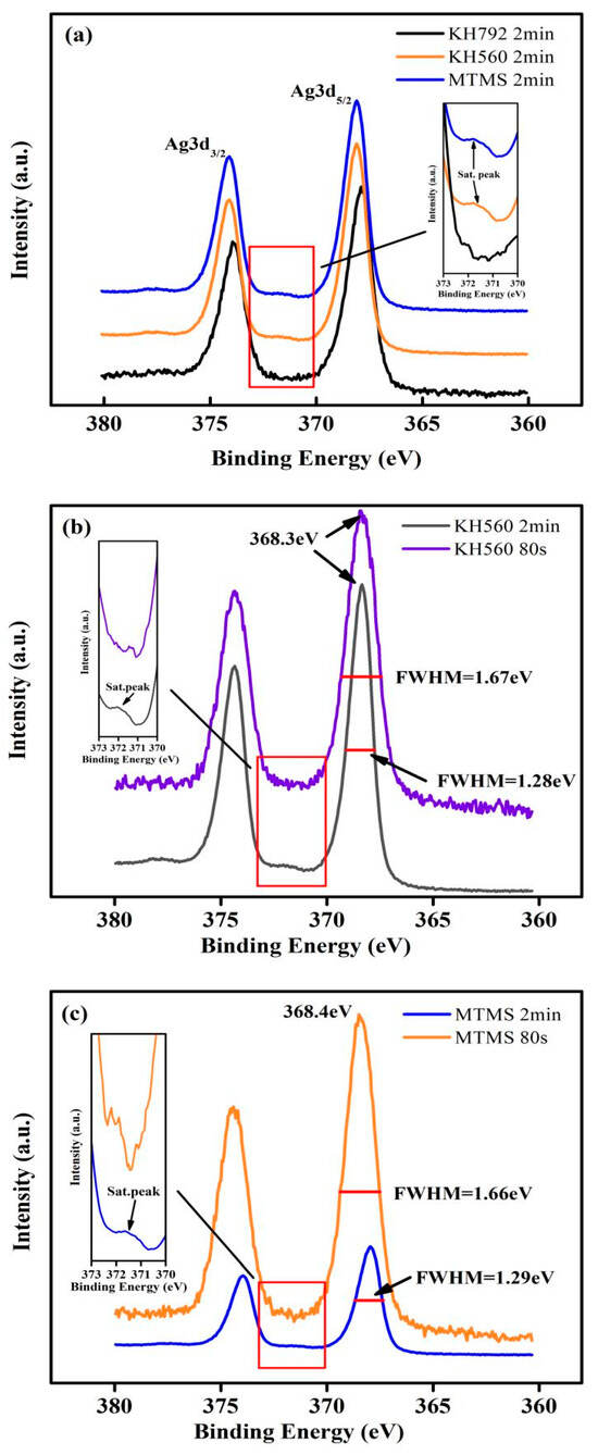 (a) Ag3d spectrum of Ag-plated M-A-FA modified by KH792, KH560, and MTMS after plating for 2 min; (b) Ag3d spectrum of Ag-plated M-A-FA modified by KH560 after plating for 2 min and 80 s; (c) Ag3d spectrum of Ag-plated M-A-FA modified by MTMS after plating for 2 min and 80 s.