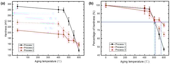 The alloys with three processes were subjected to isothermal annealing at temperatures ranging from 400 to 600 °C for one hour, with the resulting hardness variations shown in Figure 4a. It can be observed from the figure that as the annealing temperature increases, the hardness of all processed alloys decreases. Notably, for the CP alloy, the reduction in hardness becomes more pronounced at temperatures above 450 °C. After one hour of annealing at 600 °C, the hardness of the alloy was measured at 137.7 HV, representing a decrease of 154.42 HV compared to the as-fabricated state. The hardness of both DP alloys also decreased with increasing annealing temperature; however, the overall decline was more gradual compared to the CP alloy. After one hour of annealing at 600 °C, the hardness values for Process 1 and Process 2 were 159.1 HV and 154.2 HV, respectively, corresponding to decreases of 49.38 HV and 82.5 HV compared to the as-fabricated state. A comparison of the three processes reveals that the CP alloy exhibits the most significant reduction in hardness, indicating its inferior softening resistance, even though it underwent the least amount of cold deformation. It is generally understood that a higher degree of cold deformation facilitates recrystallization during annealing, leading to more pronounced reductions in mechanical properties.