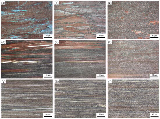 Optical microstructure of process 1 annealed at (a) 400 °C, (b) 500 °C, (c) 600 °C for 1 h, process 2 annealed at (d) 400 °C, (e) 500 °C, (f) 600 °C for 1 h, and process 3 annealed at (g) 400 °C, (h) 500 °C, and (i) 600 °C for 1 h.
