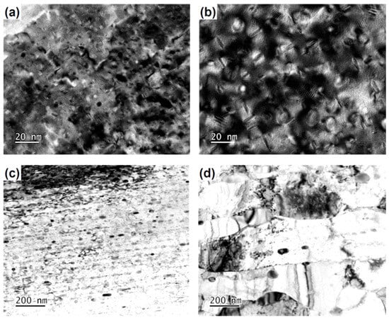 To further investigate the changes in the morphology and size of the precipitates during the softening process of the alloys with two different precipitates, transmission electron microscopy (TEM) observations were conducted, as shown in Figure 7. From Figure 7a,b, it can be observed that in the alloy containing the CP, the proportion of CP was determined to be 42.27% using Matthiessen’s rule [50], by calculating the volume fraction (φ) of Ni₂Si precipitates based on conductivity changes during the aging process. The size of the precipitates coarsens with increasing annealing temperature during isothermal annealing. At an annealing temperature of 400 °C, the size of Ni2Si precipitates is less than 10 nm, and upon reaching 600 °C, the size coarsens to approximately 20 nm. In Figure 7c,d, it is clear that for the alloy containing DP, the proportion of DP reaches 100%, with no CP observed in the alloy. This indicates that DP fully dominates the microstructure at this stage. After annealing at 400 °C for one hour, the fiber-shaped discontinuous precipitates transform into a spherical morphology while still maintaining a linear arrangement. Additionally, no recrystallized grains were observed in the alloy. After annealing the alloy at 600 °C for one hour, the initially closely packed spherical precipitates were found to coarsen, with a significant increase in the distance between the precipitates, and new recrystallized grains were observed, with grain sizes exceeding 500 nanometers.