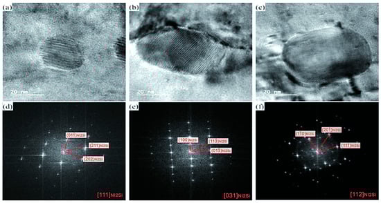 HRTEM images of the precipitated phases of the alloys containing DP annealed at (a) 400 °C, (b) 500 °C, and (c) 600 °C for 1 h and their corresponding FFTs (d) 400 °C, (e) 500 °C, and (f) 600 °C, respectively.