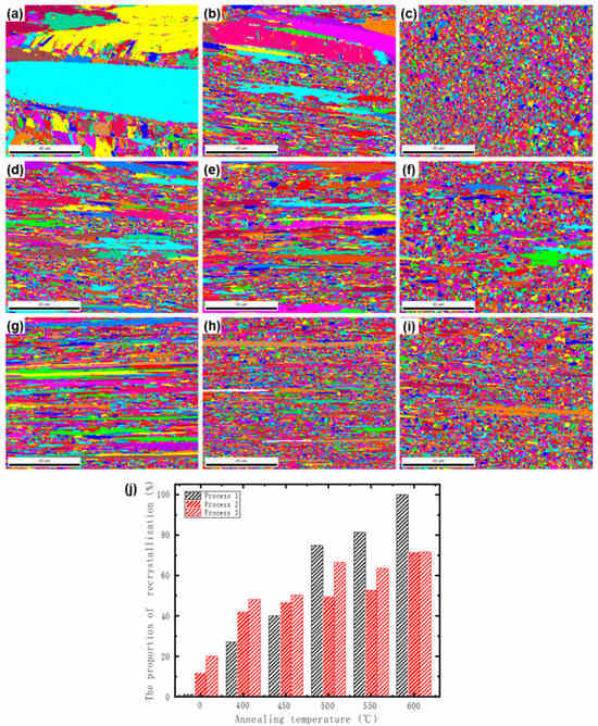 EBSD grain diagrams of process 1 annealed at (a) 400 °C, (b) 500 °C, and (c) 600 °C for 1 h, process 2 annealed at (d) 400 °C, (e) 500 °C, and (f) 600 °C for 1 h, and process 3 annealed at (g) 400 °C, (h) 500 °C, and (i) 600 °C for 1 h; Recrystallization volume fraction of alloy when annealed at different temperatures (j).