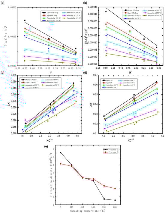 The dislocation densities of Process 1 and Process 2 at different annealing temperatures were calculated by the Modified Williamson-Hall method [51,52]. The calculated data were collected by XRD. The fitting lines for [(∆K)2 − α]/K2 − H2 and ∆K − KC1/2 are illustrated in Figure 10a,b and Figure 10c,d, respectively. The half-width of the peaks is closely related to grain size, microstrain, and defects, and it can reflect the defect concentration within the alloy matrix to a certain extent. In Figure 10, the vertical axis ∆K represents the half-width of the peaks. It is evident that as the annealing temperature increases, the half-width gradually decreases, indicating an overall downward trend in defect concentration. This suggests that the dislocation density of the alloy decreases progressively with rising annealing temperature.