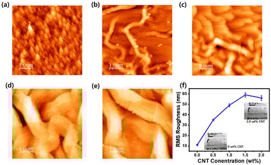 AFM images showing the surface morphology of ZnO thin films incorporated with CNTs at concentrations of (a) 0%, (b) 0.5 wt%, (c) 1.0 wt%, (d) 1.5 wt%, and (e) 2.0 wt%, fabricated using the sol–gel method. (f) RMS roughness of sol–gel-derived ZnO thin films embedded with varying concentrations of CNTs. Insets are photographic images of ZnO/sapphire and 2.0 wt% CNT-ZnO/sapphire.