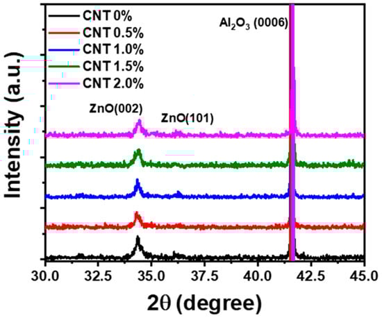 The crystallographic properties of CNT-incorporated ZnO thin films were analyzed using HR-XRD ω/2θ scans, as shown in Figure 2. The XRD patterns for ZnO films with varying CNT concentrations (0 to 2.0 wt%) were compared. Regardless of the CNT concentration, the results confirm that the (002) facet of ZnO remained the dominant crystal orientation, as indicated by the sharp peak near 34.4° corresponding to the ZnO (002) plane. This suggests that the ZnO films, grown using the sol–gel method on a c-plane sapphire substrate, exhibit strong c-axis orientation, which is the thermodynamically stable phase under the low- and high-temperature heat treatments. For the ZnO film without CNT incorporation (CNT 0%), a minor peak corresponding to the ZnO (101) plane around 36.3° was also observed, indicating the presence of a secondary orientation. However, as CNTs were incorporated into the films, the intensity of the ZnO (101) peak diminished slightly. This reduction in secondary crystallographic orientation suggests that CNT incorporation may disrupt the formation of additional planes, allowing the ZnO (002) plane to dominate. Additionally, it was observed that the (002) peak intensity slightly decreased, and the FWHM increased with the inclusion of CNTs. This broadening of the (002) peak, particularly at higher CNT concentrations, suggests a slight reduction in crystallinity. The CNTs likely introduce mechanical stress and strain during the high-temperature annealing process, disrupting the uniform growth of ZnO crystals. The buckling effect of CNTs, which is responsible for the surface wrinkle structure, may also contribute to this slight degradation in crystal orientation by inducing local distortions in the ZnO matrix during crystallization [35]. Despite these changes, the ZnO (002) phase remained well-defined even at CNT concentrations as high as 2.0 wt%. The data suggest that the incorporation of CNTs up to 2.0 wt% does not prevent the formation of high-quality ZnO (002) thin films, though the orientation and crystallinity are modestly affected by the presence of CNTs, likely due to mechanical interactions between the CNTs and the ZnO lattice during the sol–gel process.