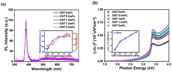 (a) Room temperature photoluminescence spectra of CNT-ZnO nanocomposite thin films excited with a 266 nm light source, and (b) absorbance spectra of CNT-ZnO nanocomposite thin films as a function of wavelength measured using ultraviolet–visible spectroscopy. Insets of (a,b) show the PL band-edge intensity, full width at half maximum (FWHM), and the (αhν)2 (1011 eV2 cm−2) values for sol–gel-derived ZnO thin films embedded with varying CNT concentrations, presented as a function of CNT incorporation.