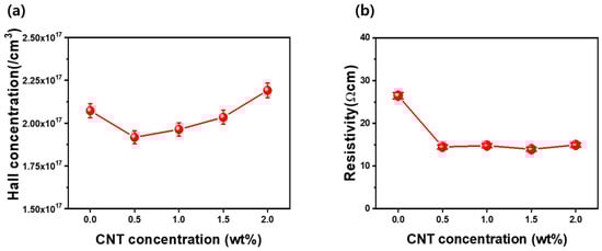 (a) Carrier concentration and (b) resistivity as a function of CNT concentration in CNT-ZnO nanocomposite thin films, measured using the van der Pauw method.