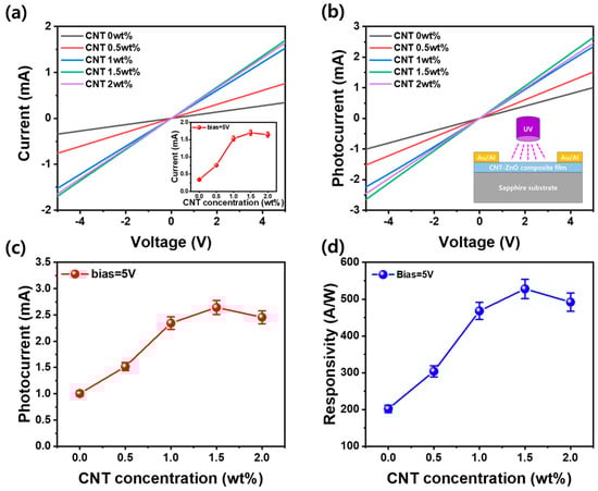 (a) Dark current–voltage and (b) photocurrent–voltage characteristics of the Al/ZnO-CNT/Al photodetector. The insets in (a,b) are a graph of the dark current as a function of CNT content at an applied voltage of 5.0 V and a schematic diagram of a CNT-ZnO nanocomposite photodetector with UV light applied, respectively. (c) Photocurrent and (d) photoresponsivity as a function of CNT content under a 5.0 V applied voltage.