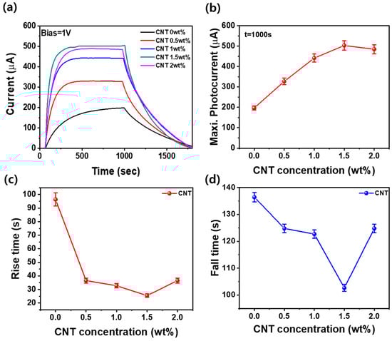 Figure 6a illustrates the photocurrent behavior over time following 950 s of UV excitation in the metal/CNT-ZnO/metal photodetector structure, along with the cessation of UV exposure. The maximum photocurrent exhibited a significant increase from 196.8 µA to 502.9 µA as the CNT content rose from 0 to 1.5 wt%. However, this maximum value slightly decreased to 484.7 µA when the CNT concentration was further increased to 2.0 wt%, as depicted in Figure 6b. The ZnO photodetector without CNTs exhibited a sluggish response to UV excitation, reaching its peak photocurrent after approximately 900 s. In contrast, the incorporation of CNTs resulted in a more rapid saturation of the photoexcited current compared to the pure ZnO photodetector. Notably, both the rising time—indicative of the photocurrent’s increase in response to UV light—and the falling time—reflecting the decrease in photocurrent after the UV light is turned off—were significantly shorter with CNT incorporation. The optimal performance was observed at a CNT content of 1.5 wt%, which resulted in the fastest rising and falling times, as illustrated in Figure 6c,d. This enhanced time-dependent reactivity at 1.5 wt% can be attributed to the formation of an optimal p-CNT/n-ZnO heterojunction, which facilitates efficient charge separation and transport. Additionally, the surface texture created by the CNTs improves the adsorption/desorption dynamics of oxygen species, enhancing the overall carrier dynamics in the photodetector.