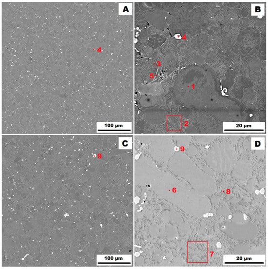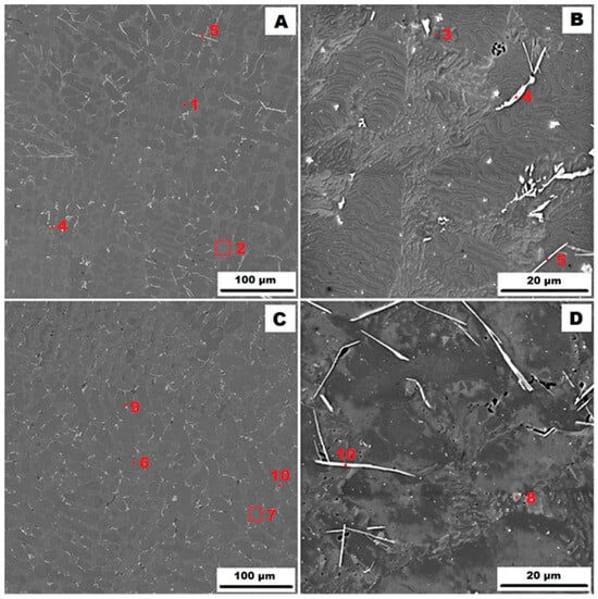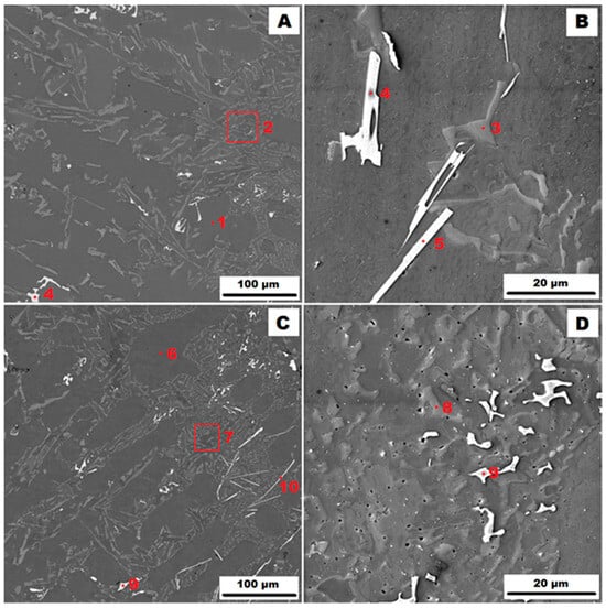 The microstructure of the gravity die-cast (GDC) AlSi10MnMg alloy is shown in Figure 2. The as-cast condition is shown in Figure 2A,B and the condition after heat treatment at 400 °C for 1 h (HT400) is shown in Figure 2C,D). It can be seen that the higher cooling rate of the metal mould (GDC) compared to the sand mould (GSC) resulted in the formation of a finer eutectic. The phase composition was similar to that of the sample cast in the sand mould. In addition to the matrix consisting of a solid solution of α(Al)—points 1 and 6 in Figure 2—a eutectic (α(Al) + Si) was observed in the structure—points 2, 3, 7 and 8 in Figure 2. 2—and secondary particles of α-AlFeMnSi, i.e., Al15(Fe, Mn)3Si2—point 9 in Figure 2—or α-(Al, Mg)FeMnSi, i.e., (Al, Mg)15(Fe, Mn)3Si2—point 4 in Figure 2. The magnesium present in this phase has probably replaced some of the original atoms. The last phase identified in the gravity die-cast (GDC) sample was the δ-phase, i.e., Al4(Fe, Mn)Si2—see points 5 and 10 in Figure 2. The identification of all phases present by EDX analysis is summarised in Table 3. Figure 2 also shows that the secondary particles were more evenly distributed along the boundaries of the eutectic regions after heat treatment.