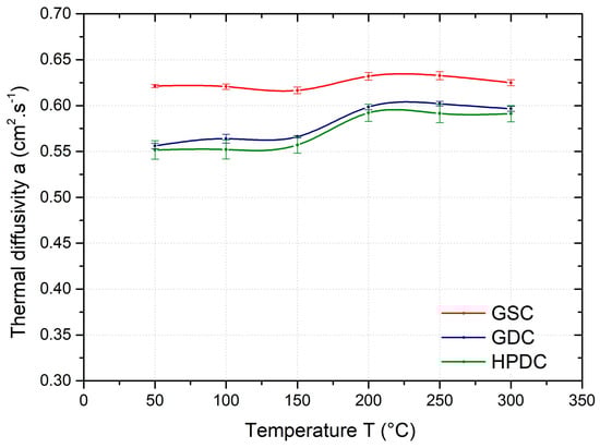 Temperature dependence of average thermal diffusivity of GSC, GDC, and HPDC samples.