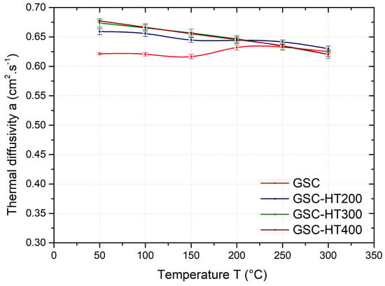 Temperature dependence of the average thermal diffusivity of GSC samples heat-treated at 200 °C (HT200), 300 °C (HT300), and 400 °C (HT400).