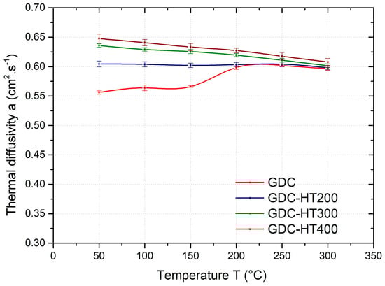 Temperature dependence of the average thermal diffusivity of GDC samples in as-cast condition and heat-treated at 200 °C (HT200), 300 °C (HT300), and 400 °C (HT400).