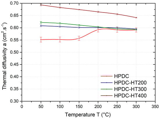 Temperature dependence of the average thermal diffusivity of HPDC samples as-cast and heat-treated at 200 °C (HT200), 300 °C (HT300), and 400 °C (HT400).