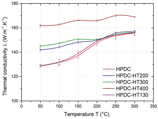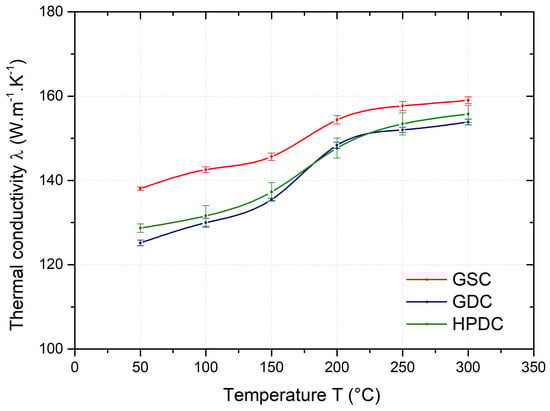 Based on the experimentally determined values of thermal diffusivity, the values of the thermal conductivity coefficient λ were calculated. In the literature [3], the value of thermal conductivity of pure aluminium is reported to be 237 [W·m−1·K−1]. Alloying elements reduce this value, whether they are dissolved in the solid solution or precipitated as a secondary phase [3,5]. The thermal conductivity of the AlSi10MnMg alloy at 50 °C was found to be in the range of 125 to 138 [W·m−1·K−1] depending on the casting process. A comparison of the temperature dependence of the thermal conductivity of individual samples, see Figure 9, shows that the thermal conductivity increases slightly with increasing temperature, with a step change at the range of 150–200 °C. In agreement with the results of [8], the highest thermal conductivity values were found for the samples cast in a sand mould (GSC). The thermal conductivity of the GSC samples was approximately 138 [W·m−1·K−1] at 50 °C, and this value increased to 159 [W·m−1·K−1] at 300 °C. The thermal conductivity of the HPDC samples was 128 [W·m−1·K−1] at 50 °C, and approximately 155 [W·m−1·K−1] at 300 °C. The thermal conductivity of the GDC samples was comparable to that of the HPDC samples. The differences in the thermal conductivity of the GSC and HPDC samples are due to the differences in the amount of dissolved alloying elements in the solid solution, size of particles in the eutectic area, and the different arrangement of secondary phases in the structure of each sample. Similar conclusions were also reported by the authors of [3,5,6].