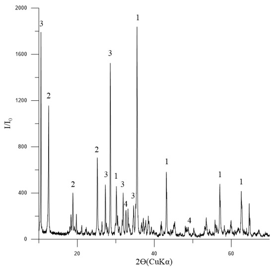 Diffractogram of the initial concentrate: 1—Fe3O4 (magnetite) [01-088-0315]; 2—(Mg,Al)6(Si,Al)4O10(OH)8 (chlorite-serpentine) [00-052-1044]; 3—Ca2Mg5Si8O22(OH)2 (tremolite) [00-013-0437]; 4—FeTiO3 (ilmenite) [01-075-0519].