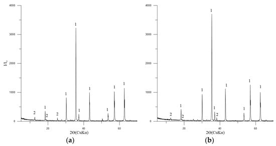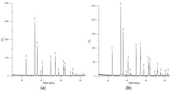 Diffractogram: (a) pellets No. 1; (b) pellets No. 2. Symbols: 1—Fe2O3 (hematite) [01-071-5088], minimum of Mg2SiO4 [01-075-1450] and CaSiO3 [01-075-4984].
