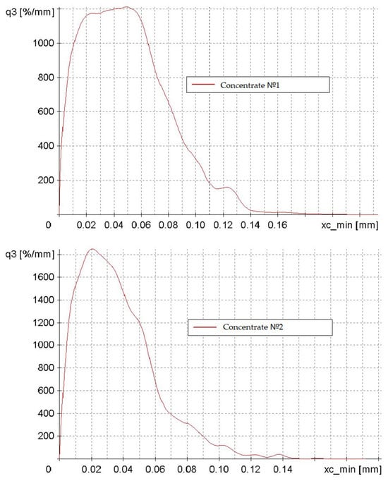 The two graphs illustrate a modal distribution with negative asymmetry, indicating that the predominant particle size of the concentrate is 0.02–0.05 mm. The particle size distribution of Concentrate No. 1 is more heterogeneous, featuring a broader range of particle sizes and a less distinct peak. The maximum density of the distribution is characteristic of Concentrate No. 2. This discrepancy can be attributed to the different enrichment methodologies employed in the initial preparation of the low-grade concentrate.