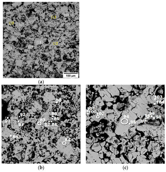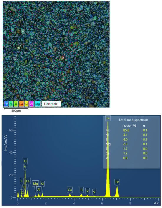 For pellet No. 2, the mineralogical composition is detailed in Figure 8b,c. This pellet also prominently features hematite, as indicated by the spectra labeled (83, 84, 89–95), and (101–103). Additionally, there is a minor presence of Fe2TiO5, known as pseudobrookite, which can be identified in spectra (85–88, 96–99), and (104).